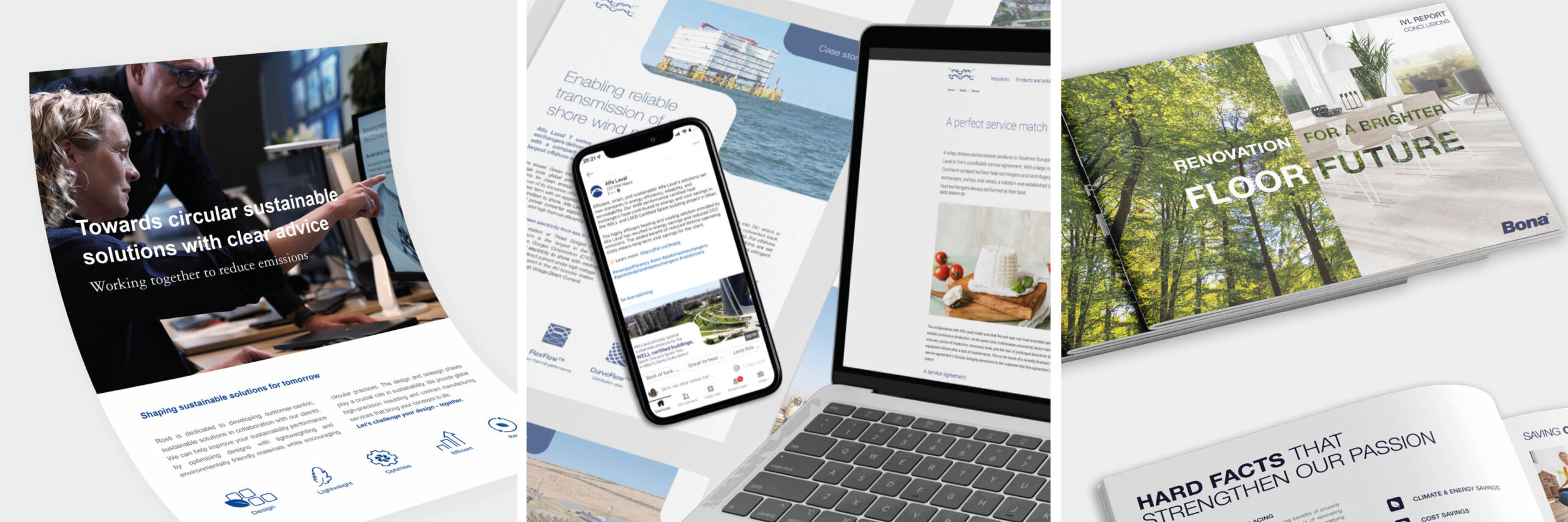 Adentity worked closely with Bona’s marketing and corporate communications to build an integrated communication and brand platform. This included the development of Bona’s environmental platform, “On Track for Sustainability.” Adentity also presented the outcomes of Bona’s value chain analysis with the Swedish Environmental Institute and explained new EMICODE regulations by using clear visuals, messaging, and key graphics.